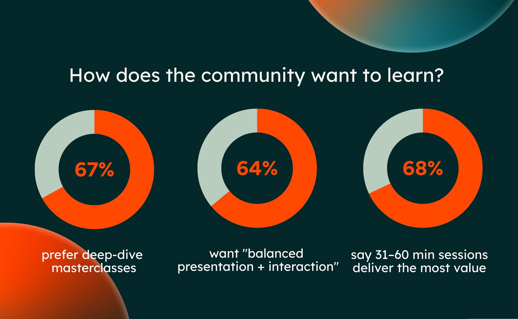 Deep dives are in. Passive listening is out: Deep-dive sessions emerged as the top preferred format. The longer-form sessions allow speakers to get into the details, show the work, and answer real questions.
